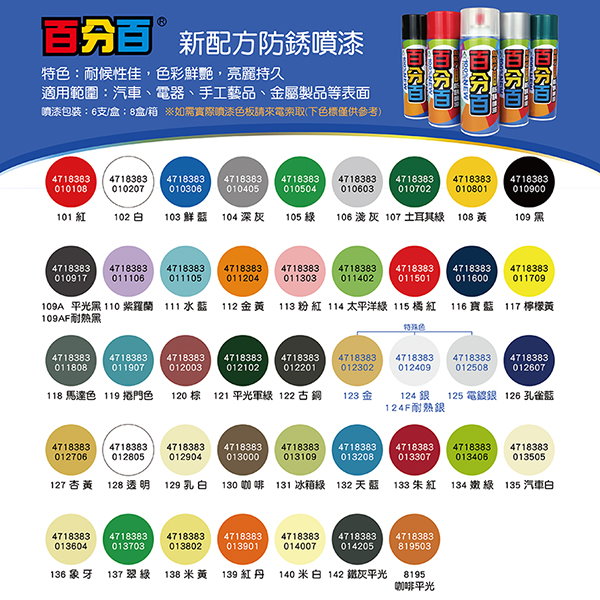 產品介紹 : 新配方防鏽噴漆,耐候性佳,色彩鮮艷,亮麗持久,顏色種類眾多