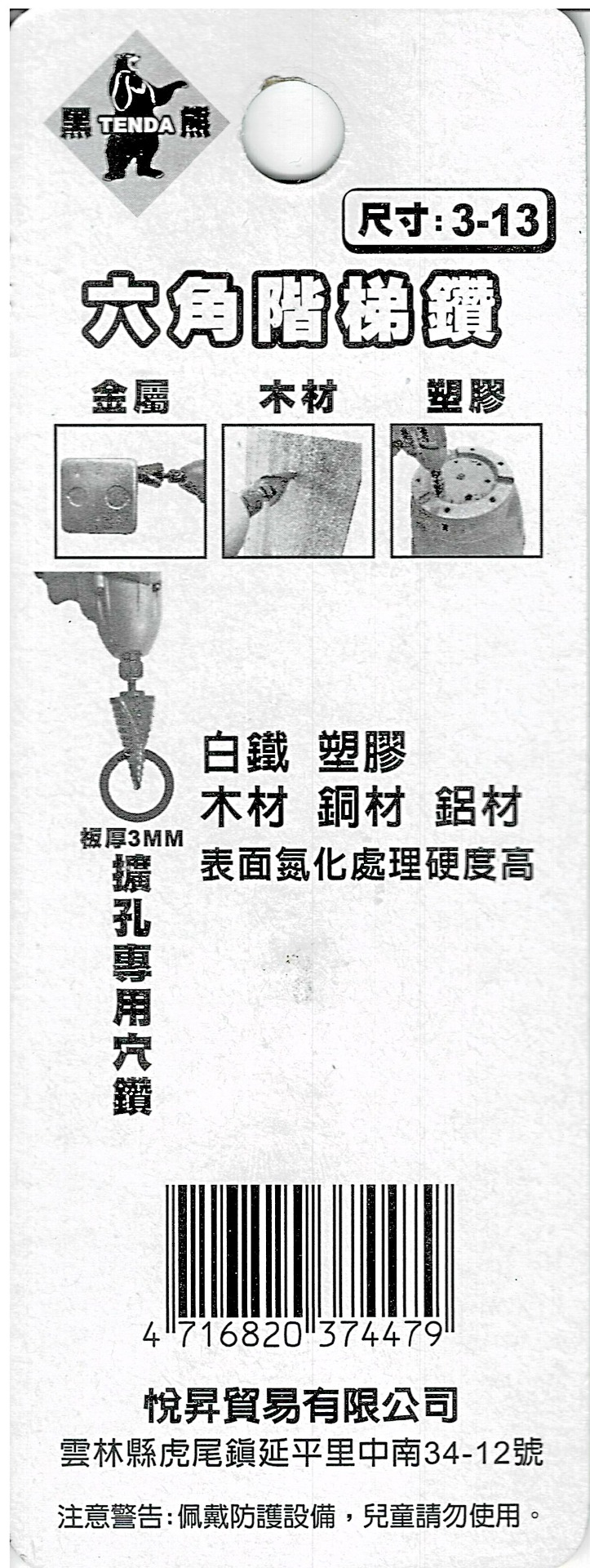 TENDA 黑熊 階梯鑽 螺旋式 含鈷 HCC-CO 六角柄