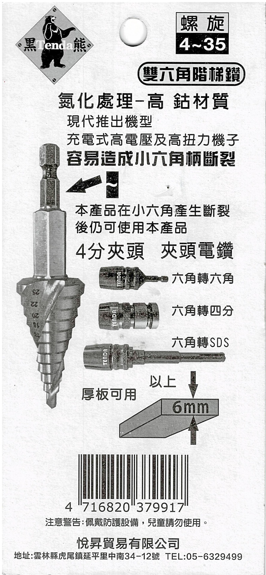 商品特色:M2材質含高鈷材質表面氮化處理用途: 白鐵、塑膠、木材、鋼材、鋁材、鐵板皆可用雙六角柄設計小六角柄斷了還能繼續用商品規格:螺旋4-25mm 尺寸:4、6、8、10、12、16、18、20、22、25mm(11階)。總長度:110mm。螺旋4-35mm 尺寸:4、6、8、10、12、16、18、20、22、25、28、30、32、35mm(14階)。總長度:115mm產地:台灣